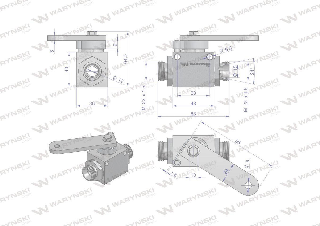 Zawór odcinająco-zwrotny ogranicznik posuwu/skoku 2/2 m22x1.5 15l z otworami mocującymi 350 bar waryński