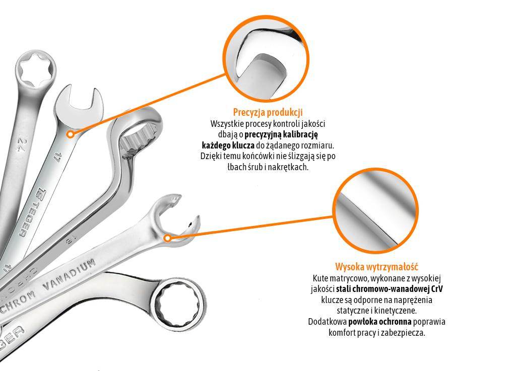 Zestaw kluczy płasko-oczkowych 47 szt / teger wykonany ze stopu stali chromowo-wanadowej crv, wytrzymałej na naprężenie statyczne i kinetyczne. Unikalna powłoka na powierzchni znacząco zwiększa komfort pracy oraz pozwala na utrzymanie narzędzi w czystości. Klucz kuty matrycowo, odpory na odkształcenia doskonale wykalibrowany. Dwunastokątna końcówka klucza płasko-oczkowego, dodatkowo wygięta ułatwia manewrowanie kluczem. Zawartość zestawu: rozmiar kluczy płasko-oczkowych: 6 / 7 / 8 / 9 / 10 / 11 / 12 / 13 / 14 / 15 / 16 / 17 / 18 / 19 / 20 / 21 / 22 / 23 / 24 / 26 / 27 / 28 / 30 / 32 mm; rozmiar kluczy oczkowych, giętych: 6×7 / 8×9/ 10×11 / 12×13 / 14×15 / 16×17 / 18×19 /2 0x22 mm; rozmiar kluczy oczkowych, giętych u: 10×11 / 12×13 / 14×15 / 16×17 / 18×19 mm; rozmiar kluczy torx: 6×8 / 10×12 / 14×18 / 20×24 mm; rozmiar kluczy do przewodów hydraulicznych: 8×10 / 9×11 / 10×12 / 13×14 / 15×17 / 16×18 mm.