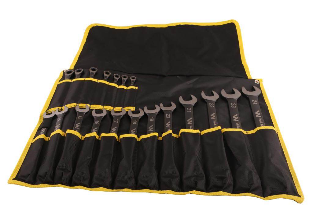 Zestaw kluczy płaskooczkowych z grzechotką standard w pokrowcu 19 szt rozmiary od 6-24 w standardzie asme b107-2010 waryński