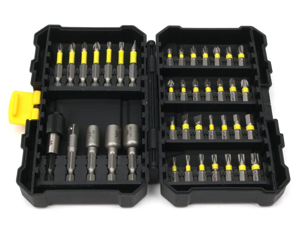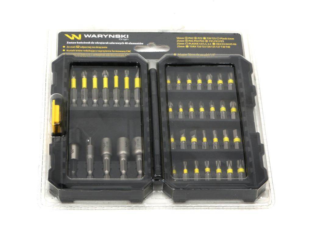 Zestaw końcówek wkrętakowych do wkrętarek udarowych, ze stali s2 odpornej na skręcanie, z uchwytem szybkowymiennym do bitów i nasadką adapterem, 40 elementów w zestawie. Kształt końcówek wkrętakowych w zestawie formowany przy użyciu cnc, redukujący zagrożenia związane z wykorzystaniem udaru. Waryński