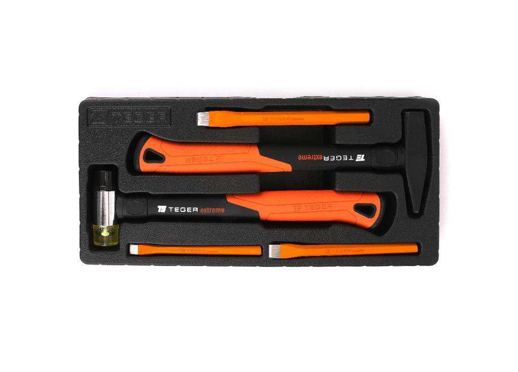 Zestaw młotków i przecinaków (5 el.) Extreme / teger profesjonalny zestaw przeznaczony do prac ślusarskich i blacharskich. Przecinaki wykonane z wysokiej jakości stali chromowo-wanadowej, przedłużającej żywotność narzędzia. Młotki z uchwytami z włókna szklanego zapewnią trwałość i solidność w codziennej pracy zarówno profesjonalistów jak i domowych majsterkowiczów. Zawartość zestawu: młotek ślusarski z trzonkiem fiberglass extreme: 300g, młotek blacharski 30 mm z trzonkiem fiberglass extreme, przecinaki 10mm, 13mm, 16mm. Zestaw dostarczany w wytłoczce z tworzywa, pasującej do większości szuflad szafek warsztatowych.