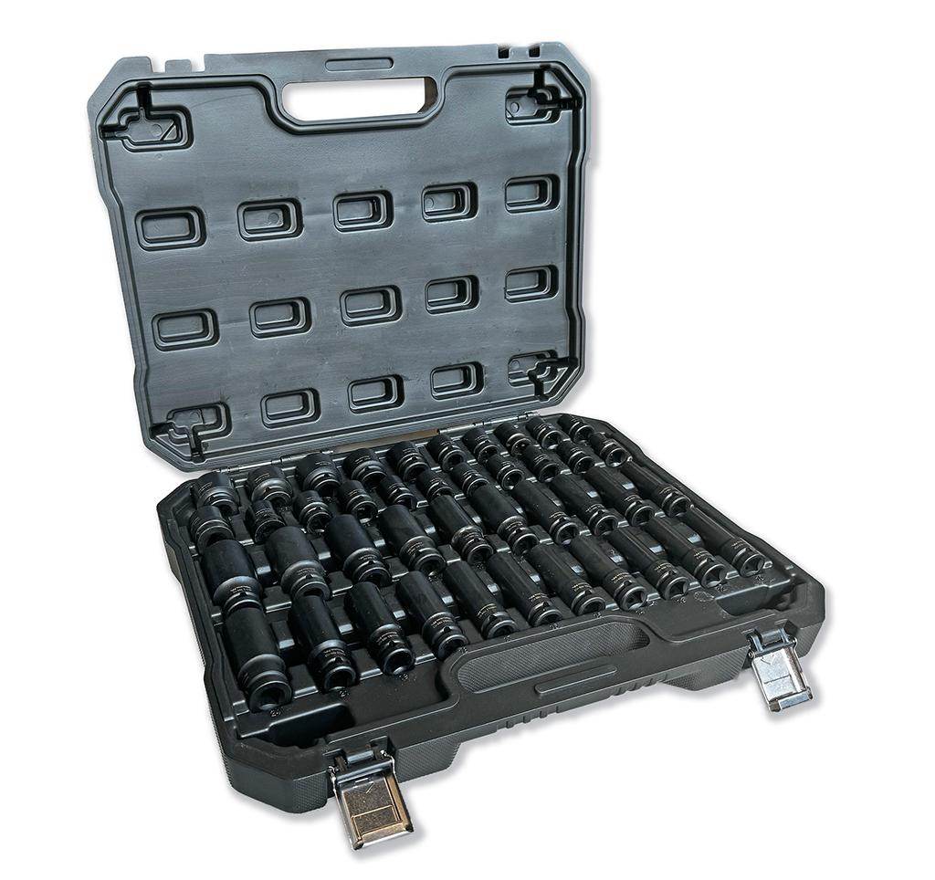 Zestaw nasadek udarowych 1/2 ” metrycznych i calowych sześciokątnych 42 nasadek standadowch i przedłużanych rozmiary 10 11 12 13 14 15 16 17 18 19 21 24 mm i calowe 3/8″, 1/2″, 9/16″, 5/8″, 3/4″, 13/16″, 15/16″, 1″, 1-1/16″ & 1-1/18″ ze wzmocnionej stali crmo waryński