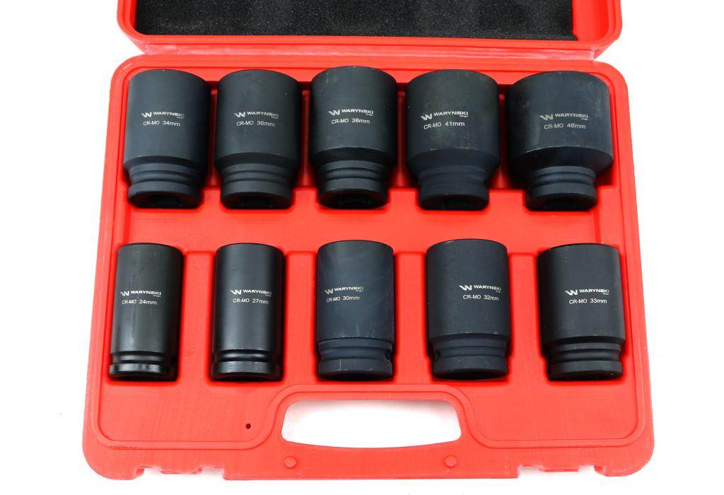 Zestaw nasadek udarowych długich 3/4″ sześciokątnych 10 nasadek rozmiary 24 27 30 32 33 34 36 38 41 46 mm ze stali crmo din3129 waryński