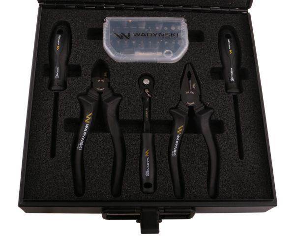Zestaw nasadek w kasecie metalowej. 68 el. Waryński z nasadkami, szczypcami, wkrętakami i grzechotką