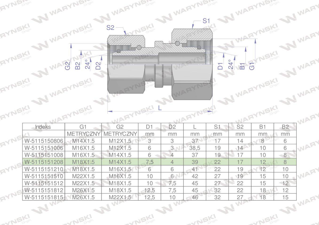 Złączka hydrauliczna metryczna aa m18x1.5 12lxm14x1.5 08l waryński 2szt