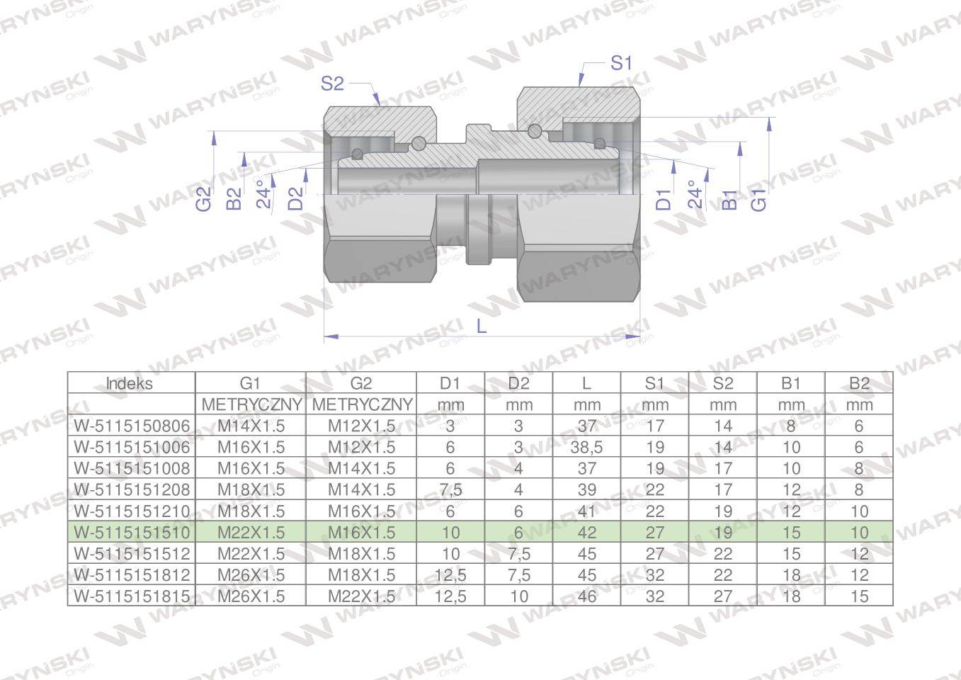 Złączka hydrauliczna metryczna aa m22x1.5 15lxm16x1.5 10l waryński 5szt