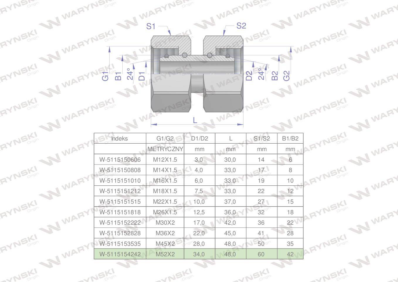 Złączka hydrauliczna metryczna aa m52x2 42l waryński
