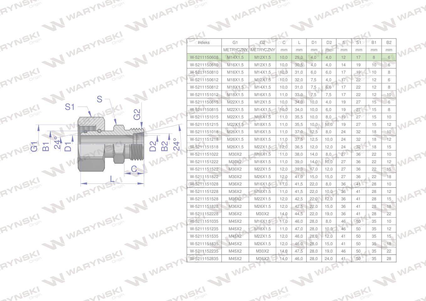 Złączka hydrauliczna metryczna ab (xkor) a-m14x1.5 08l / b-m12x1.5 06l waryński. Elementy złączne zostały zaprojektowane i wykonane zgodnie z obowiązującymi normami, które szczegółowo opisują wymagania jakościowe i wymiarowe. Są kompatybilne z elementami złącznymi innych renomowach producentów hydrauliki siłowej.