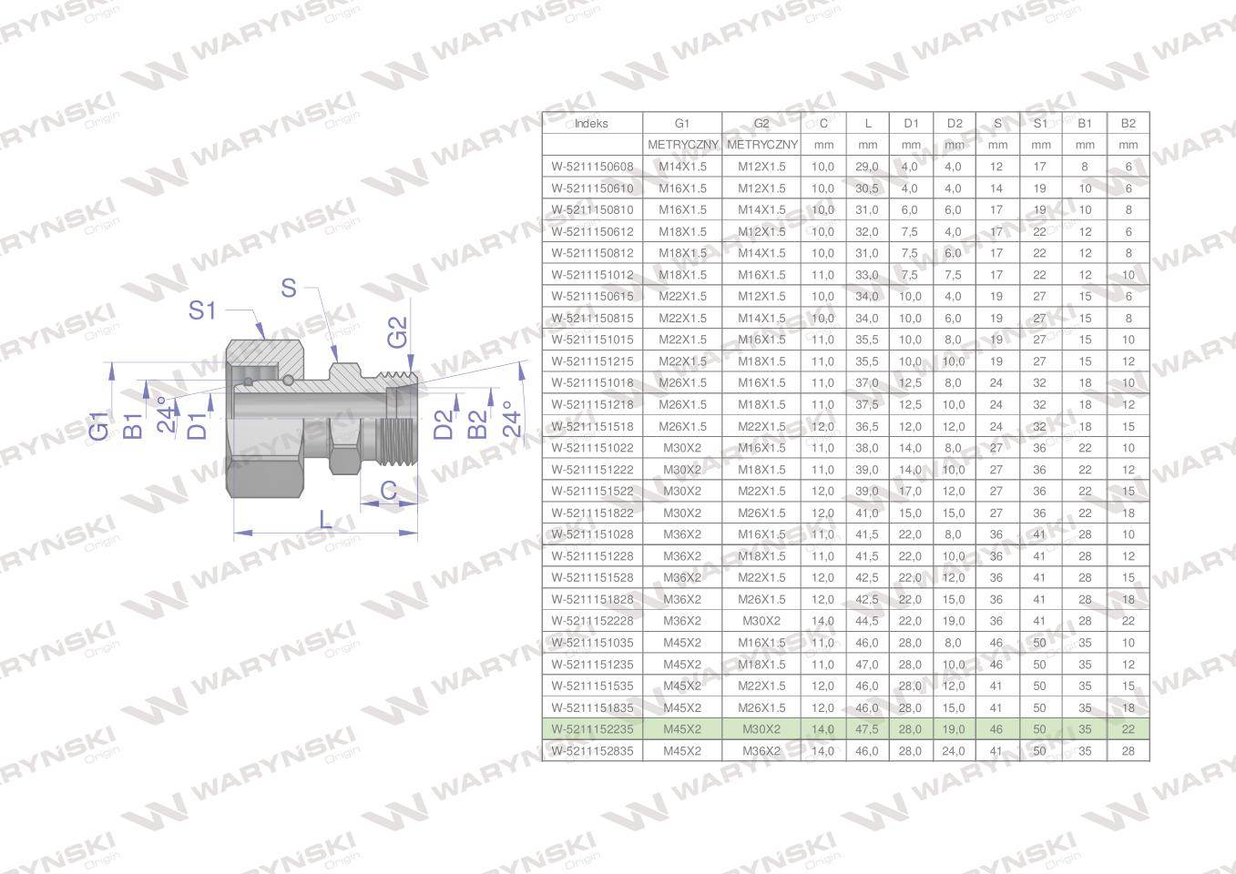 Złączka hydrauliczna metryczna ab xkor a-m45x2 35l b-m30x2 22l waryński