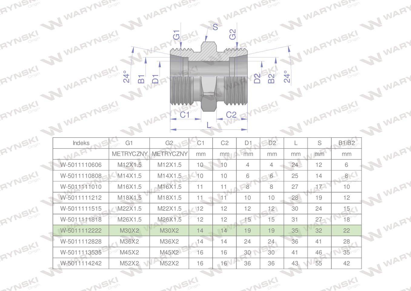 Złączka hydrauliczna metryczna bb m30x2 22l xg waryński 5szt